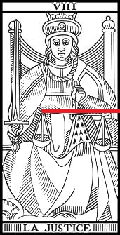 Si nos dejamos llevar por la apariencia de la carta de La Justicia -y el nombre que le damos forma parte de sus apariencias- concebimos en nuestra mente esa idea idealizada de la justicia que analizábamos anteriormente. Pero siguiendo el aprendizaje del Arcano VII (El Carro) vamos a traspasar el velo de la conciencia y analizar en sus detalles el verdadero mensaje oculto en su imagen. Teniendo en cuenta que es una carta que usualmente se la interpreta a partir de la idea de "equilibrio", veamos algo que refleja su fundamental "desequilibrio": si ubicamos una regla sobre la barra que sostiene los dos platillos de la balanza podremos apreciar con claridad que se encuentra inclinada. Y, si observamos más detenidamente, vemos que la rodilla derecha está empujando un platillo hacia arriba y que el brazo izquierdo empuja el otro extremo de la barra hacia abajo.